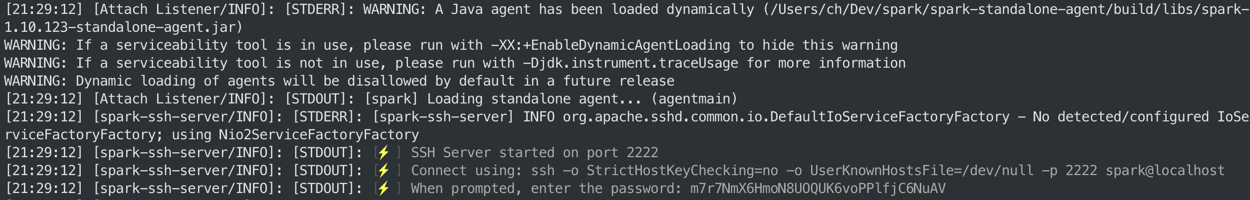 Once the agent is attached, you can interact with it using a special SSH interface. When the agent starts, it will print connection instructions to the application console/log output.