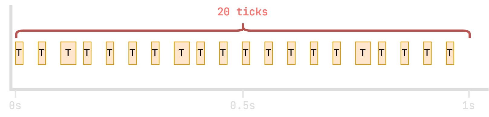 The Minecraft server aims to run exactly 20 of these game "ticks" every second, or in other words, one tick every 50 milliseconds.